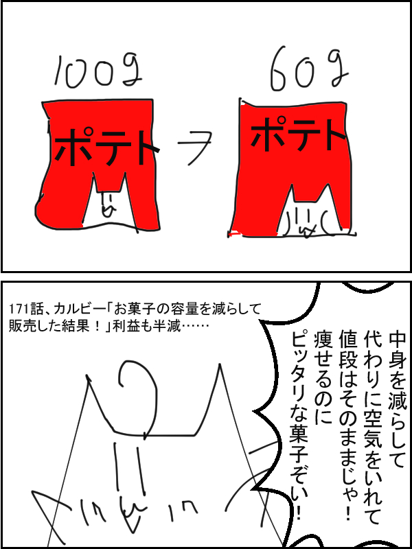 カルビー「もっと利益出すために中身を減らそう。作れる商品の数が増えるし。一袋30グラムくらいにして、ライトとかダイエットタイプとかに改名すれば……いけるか?」