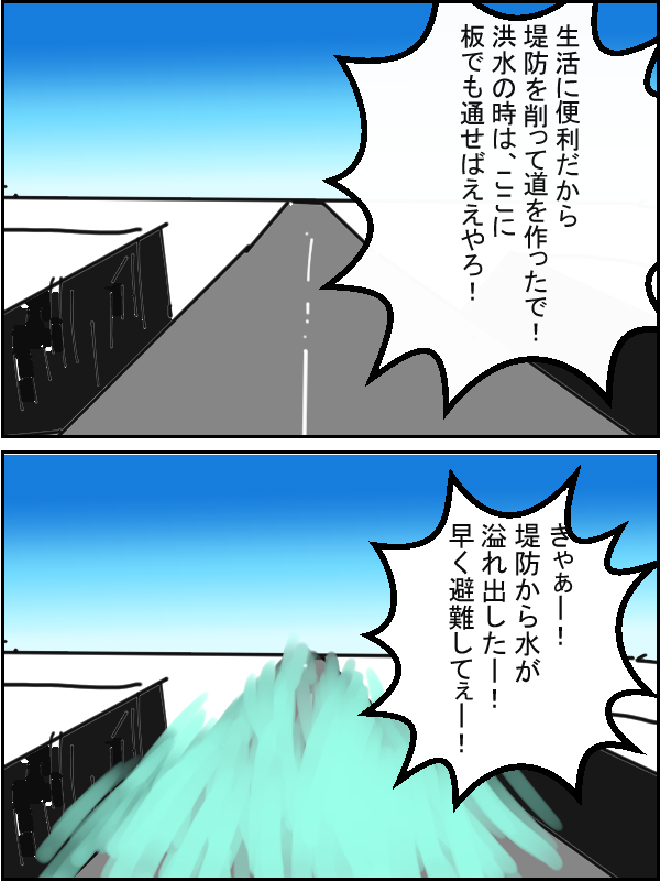 ★(ノ゜ω゜)(ノ゜ω゜)先生ぇー!どういう事だぁー! †(´・ω・`)洪水になりそうだと判断したら、現地の人らが道を防いで、洪水を防ぐ仕様なんじゃ! ★(ノ゜ω゜)(ノ゜ω゜)でも、機能してないよ!? †(´・ω・`)昔は若い人が多かったんじゃろうけど、高齢化が進んでおるしのう…… 決断力が重視されるし……難易度高いじゃろ? ★(ノ゜ω゜)(ノ゜ω゜)なら、道を埋めて、堤防の隙間をなくそうよ! 堤防の上に道路を作ればいいでしょ! †(´・ω・`)うむ……その方がええじゃろうな……多少、不便になるじゃろうけど。 【平成の歴史+日本の歴史】☚まとめたページ 記事を日付順に表示する(´●ω●`)? 自作漫画を一覧表示する(´;ω;`)? | ||