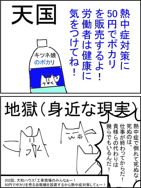 | 大和ハウス「工事現場のみんなぁー!50円でポカリを売る自販機を設置するから熱中症対策してぇー!」 | 2017 8/12 |