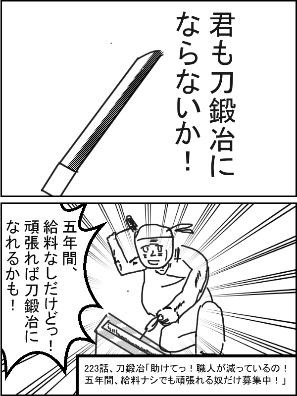 刀鍛冶「助けてっ!職人が減っているの!五年間、給料ナシでも頑張れる奴だけ募集中!」 | 2017 8/18 |