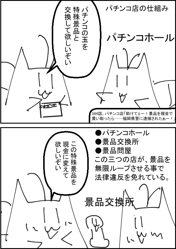 ★(ノ゜ω゜)(ノ゜ω゜)先生ぇー!パチンコ店が危ないぞぉー! †(m´・ω・`)これは……従業員が、特殊景品を買い取っていたのが問題だったんじゃ……? ★(ノ゜ω゜)(ノ゜ω゜)どういう事? †(m´・ω・`)パチンコ店は三つの店が、景品を無限ループさせる事で、法律違反を免れておるんじゃよ パチンコホール⇒玉を、景品と交換する 景品交換所⇒ 景品を、現金と交換する 景品問屋⇒ 景品を買い取って、パチンコホールへと流して無限ループ ★(ノ゜ω゜)(ノ゜ω゜)腹黒い!? †(m´・ω・`)商売の知恵じゃな? ★(ノ゜ω゜)(ノ゜ω゜)今回の場合は何が問題なの? †(m´・ω・`)……景品交換所を別名義にし忘れたとか……そんな感じだったり……? ★(ノ゜ω゜)(ノ゜ω゜)もっと推理しろよ!? 【平成の歴史+日本の歴史】☚まとめたページ 記事を日付順に表示する(´●ω●`)? 自作漫画を一覧表示する(´;ω;`)? | ||