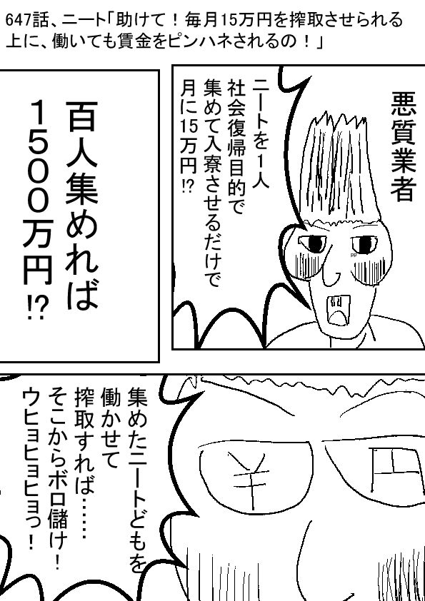 この件のような儲け方をするビジネスを「貧者ビジネス」って言うんだが、貧者ビジネスはクズの温床だからな。 ニート搾取の話以外だと、生活保護受給者を、わざと高い家賃の場所を紹介して宿泊させて搾取したり、 障害者を、働かせてるにも関わらず、ボランティア労働扱いにさせて給料をまともに払わずに搾取するクズが居るが、 罰則が緩すぎるから、そういう業者がはびこる。発覚したら罰金は1000万とかならもう少しクズが減ると思うんだよな。 金銭的な罰則が緩いから機能していないし、法律も機能していないから、 「規制の目をかいくぐるやり方」があるってソースに書いてあったけど、 法律違反や規制の違反ではないから、合法であるため、問題ない。みたいな事を言ってくるんだよな。 違う話題だけど、この前の高速道路で停車させた人間に、危険運転致死傷が何故適応されないの?みたいな話と根幹の部分(法律が整備不足である点)は一緒。