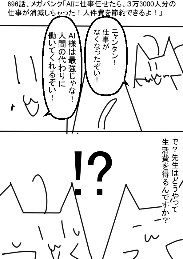 ★(ノ゜ω゜)(ノ゜ω゜)先生ぇー!ニートが増えます! †(m´・ω・`)うむ、人間が労働する必要がなくなってウハウハじゃな? ★(ノ゜ω゜)(ノ゜ω゜)こら!?仕事が減った分、大勢の人が貧しくなるだろ?! †(m´・ω・`)異世界に転生すればええんじゃ。そんで狐娘をモフモフしてスローライフ ★(ノ゜ω゜)(ノ゜ω゜)アンタ現実逃避したいだけだろ!? †(m´・ω・`)富の再分配を、AI様にやらせばいいんじゃ!そうすれば貧しい人が減るぞい! ★(ノ゜ω゜)(ノ゜ω゜)そのAIを運用する組織が暴走したらどうするんだ!? †(m´・ω・`)異世界に転生する? ★(ノ゜ω゜)(ノ゜ω゜)だめだ!?この人! |