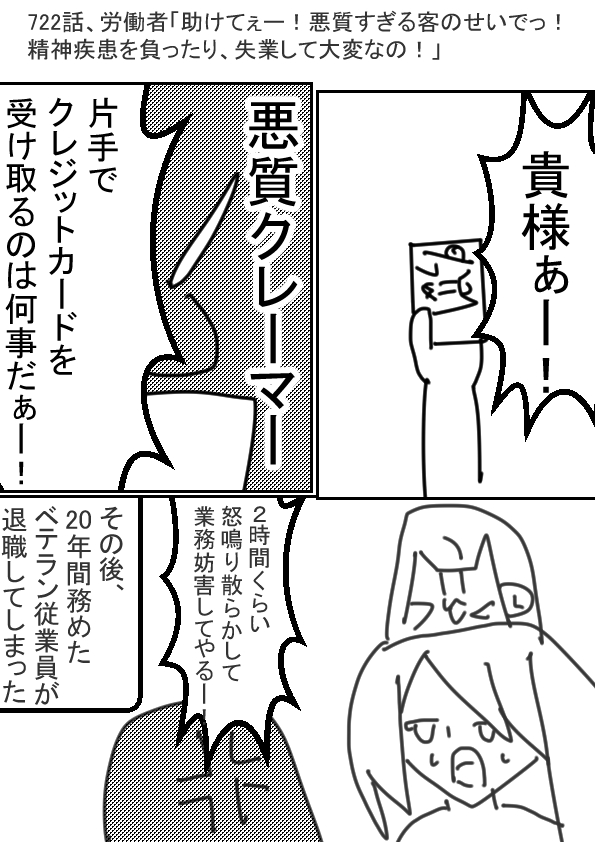 >中には「ポイントカードの入力を間違えたスタッフが土下座をさせられ犯罪者呼ばわりされた」とか「客の勘違いで購入した商品を間違えたのに『店の説明不足だ』と自宅に呼び出され、返金を要求された。深夜1時までおよそ10時間にわたって拘束された」、「酔っている客から横腹を殴られた」といった記述がありました。 ★(ノ゜ω゜)(ノ゜ω゜)どういう事なんだぁー!? どうして、現実はここまでクソゲーなんだー!? †(m´・ω・`)異世界で狐娘をモフモフすればワンチャンス…… ★(ノ゜ω゜)(ノ゜ω゜)こら!?異世界転生をオススメするな!? †(m´・ω・`)お客様は神様なんじゃよ。つまり、労働者は虫けらじゃな? ★(ノ゜ω゜)(ノ゜ω゜)どんなナザリック地下大墳墓の邪神達の価値観だ!? †(m´・ω・`)おそらく……クレジットカードが、このお客にとっての人生の全てだった……そんな感じかのう……2時間も説教するのは疲れるし…… ★(ノ゜ω゜)(ノ゜ω゜)(どんな人生だ……?それ……?) |