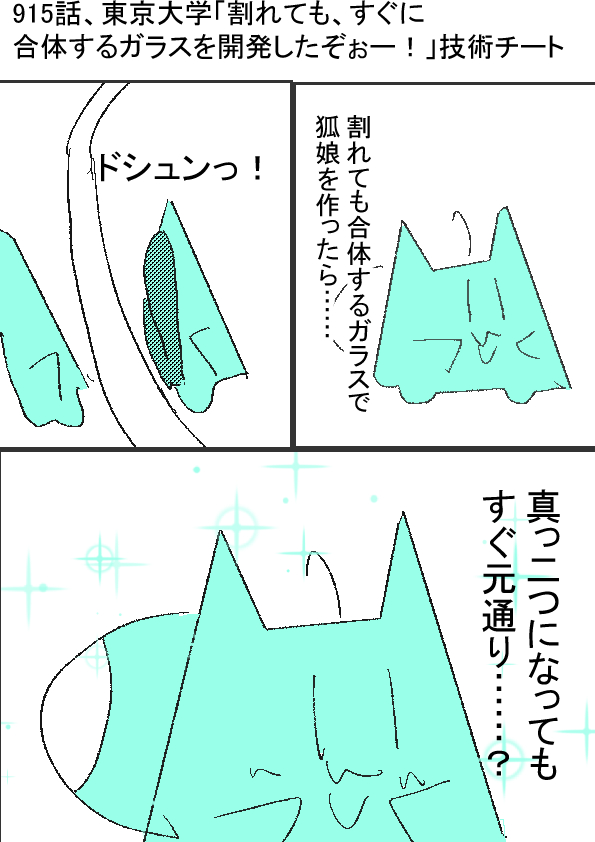 ー- ★(ノ゜ω゜)(ノ゜ω゜)先生ぇー!記憶形状合金がもうすぐ誕生するフラグですよ!これ!(割れても自動修復されるという意味 -ー †(m´・ω・`)これでスマホを落としまくっても大丈夫じゃな? ー- ★(ノ゜ω゜)(ノ゜ω゜)いや、盛大に割れたら、パズルゲームみたいにガラスを嵌めないとダメなんじゃ……? -ー †(m´・ω・`)あとはガラス業界からの圧力をなんとかすればワンチャンス ー- ★(ノ゜ω゜)(ノ゜ω゜)え? -ー †(m´・ω・`)だって割れないガラスなんて存在したら……需要が激減して、作っても作っても売れなくなるじゃろ? 当然、ガラス業界の誰かが嫌がらせを企むに違いな―― ー- ★(ノ゜ω゜)(ノ゜ω゜)こらー!?ひどい予想をするなー!? 先生も真っ二つにして、合体するかどうか確かめてやるー! -ー †(m´・ω・`)ちょおま……アッー! |
