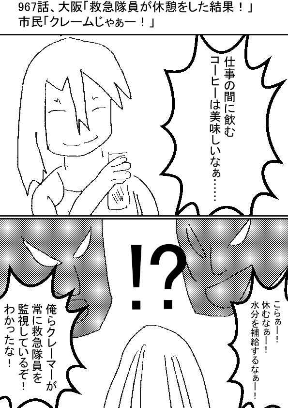ー- ★(ノ゜ω゜)(ノ゜ω゜)先生、なんでクレームがくるの? -ー †(m´・ω・`)休憩=さぼっていると判断しちゃう人がいるんじゃよ ー- ★(ノ゜ω゜)(ノ゜ω゜)じゃ、先生も怒られましょう。 休憩ばっかりじゃないか!?アンタの人生! -ー †(m´・ω・`)クレームは受け付けん!狐娘をもってこい! ー- ★(ノ゜ω゜)(ノ゜ω゜)ふざけるな!お前には休憩なんて必要ないんだぁー! -ー †(m´・ω・`)そんなブラック企業待遇は嫌じゃ! 長時間労働なのに、油断したら身体が消し飛ぶ現場とかに、また飛ばす気じゃろ!?お主ら! |