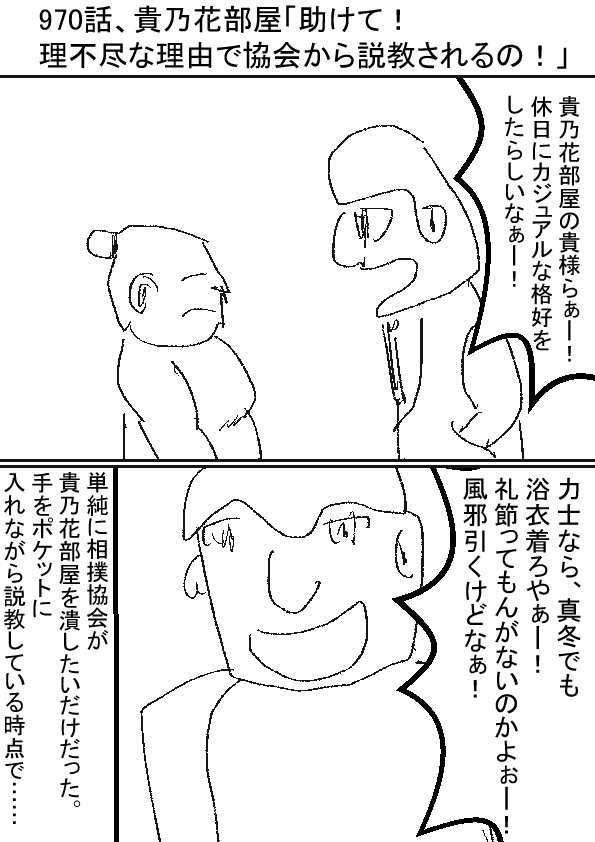 他の部屋の力士とかも散々目撃されてるのに、ラフな格好で外出とは礼儀がなってないって、部屋に押しかけてきて指導とか宣ってる。