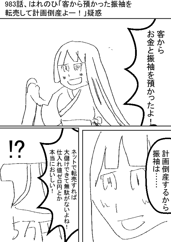 ー- ★(ノ゜ω゜)(ノ゜ω゜)これ……ありえるの? -ー †(m´・ω・`)仕入れ値ゼロで振袖預かって、転売とか……商売として美味しいじゃろ…… ー- ★(ノ゜ω゜)(ノ゜ω゜)さすがに、客から預かった振袖を転売とか……犯罪すぎますよ……? -ー †(m´・ω・`)でぇじょうぶだ。旅行会社みたいに、金だけとって海外に置き去りにするのを比べれば……命の危険がないぞい? ー- ★(ノ゜ω゜)(ノ゜ω゜)てるみくらぶの事件と比べるなよ!? -ー †(m´・ω・`)(はれのひ……じゃなくて、あめのひ……じゃな……この有様じゃと……) |