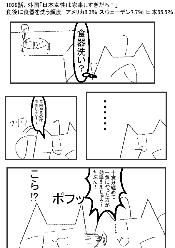 ★(ノ゜ω゜)(ノ゜ω゜)どういう事だ!? 20回に一回くらいしか、食器を洗わないアメリカとか、どうなっているんだ!? -ー †(m´・ω・`)最恐じゃな? ー- ★(ノ゜ω゜)(ノ゜ω゜)不潔だよ!? -ー †(m´・ω・`)日本で、食器を使いまわすと、夏とかは食中毒で病院送りじゃな…… ー- ★(ノ゜ω゜)(ノ゜ω゜)アメリカとか、どんだけ手抜きしているんだよ……先生ぇ…… -ー †(m´・ω・`)(スウェーデンみたいな寒い国はともかく……アメリカはどうしてこうなった……) >食後に食器を洗う頻度 アメリカ8.3% スウェーデン7.7% 日本55.5% |