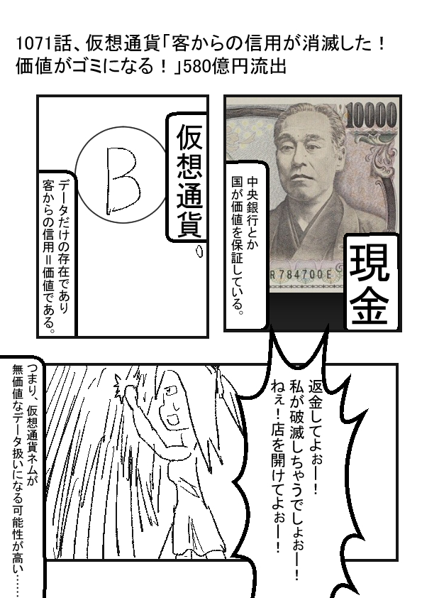 ー ★(ノ゜ω゜)(ノ゜ω゜)先生ぇー!大変だぁー! -ー †(m´・ω・`)うむ、倒産じゃな? ー ★(ノ゜ω゜)(ノ゜ω゜)最悪な予想をするな!? -ー †(m´・ω・`)だって、今回の件で信用が消滅するじゃろ? 多くの客が返金を求めてくるじゃろうし…… 仮想通貨ネムおしまいじゃな? 国家が価値を保証してないから、客の信用がなくればゴミになるぞい ー ★(ノ゜ω゜)(ノ゜ω゜)仮想通貨やっている企業群が倒産したら、大勢の人が破滅しちゃうよ!? -ー †(m´・ω・`)うむ……死人が増えて、人生はクソゲーじゃな……夢の世界が一番じゃよ…… (ˇωˇ)スヤァ… ー ★(ノ゜ω゜)(ノ゜ω゜)寝るなぁー! -ー |