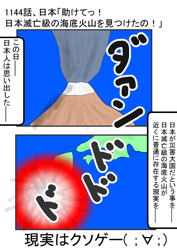 ー ★(ノ゜ω゜)(ノ゜ω゜)つまり、どういう事だ?! -ー †(m´・ω・`)海底火山が爆発して、日本の領土が増える? ー ★(ノ゜ω゜)(ノ゜ω゜)日本が壊滅したら、隣国が領土を掻っ攫いにくるだろ!? -ー †(m´・ω・`)でぇじょうぶだ。 噴火する確率は1%だ。 ー ★(ノ゜ω゜)(ノ゜ω゜)1%の確率で、日本滅亡とか、高すぎるだろ!? -ー †(m´・ω・`)(鬼界カルデラ……このネーミングセンスからして、やばいものだと分かるのう……) |