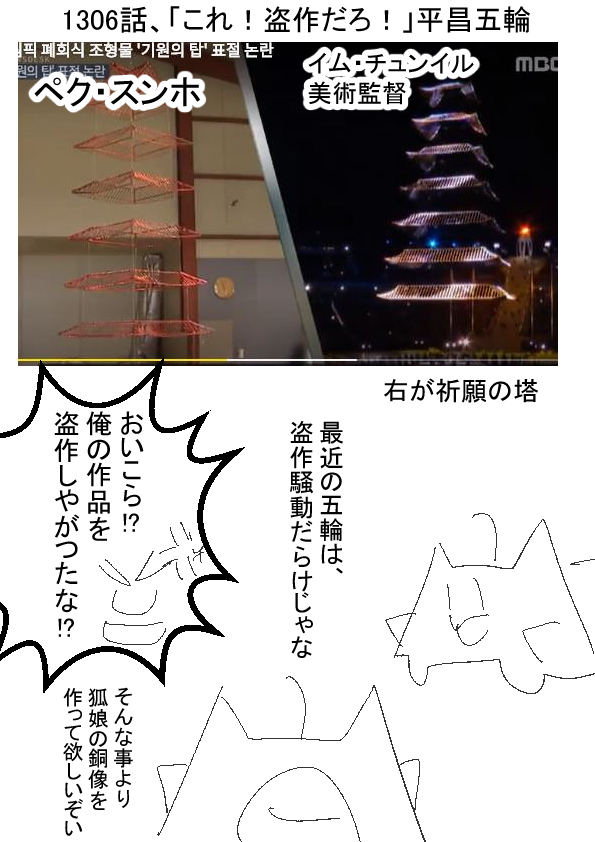 ー ★(ノ゜ω゜)(ノ゜ω゜)先生ぇー!そんなことを言ったら、アンタの漫画も盗作だろー!? ーー †(´・ω・`)なんじゃと!? ー ★(ノ゜ω゜)(ノ゜ω゜)ほら、事件の記事の場合は、事件のあった建物を真似て、描いているだろ!? 実際に存在する人物を、脳内で想像して、絵にしたりしているだろぉー! 盗作だ! ーー †(´・ω・`)そんな!? ー ★(ノ゜ω゜)(ノ゜ω゜)今回の平昌五輪のアレは、ほとんど同じような感じで、盗作の可能性が高いけどさ! アンタには、この記事を描く資格そのものがないんだよ! ーー †(´・ω・`)そんなぁぁぁぁぁ! |