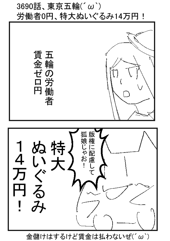 ー ★(ノ゜ω゜)(ノ゜ω゜)先生ぇー!別に14万円でもいいだろー! 東京五輪の赤字を埋めるためなんだからさぁー! ーー †(´・ω・`)う、うむ……? ー ★(ノ゜ω゜)(ノ゜ω゜)経済が回るだろ! ーー †(´・ω・`)でも、労働者の日給ゼロ円じゃよ? ー ★(ノ゜ω゜)(ノ゜ω゜)労働者はお客じゃないんだよ! ーー †(´・ω・`)こら!? 労働者も、ちゃんと宿泊費とかで金を落とすぞい!? 日給ゼロ円じゃけど! |