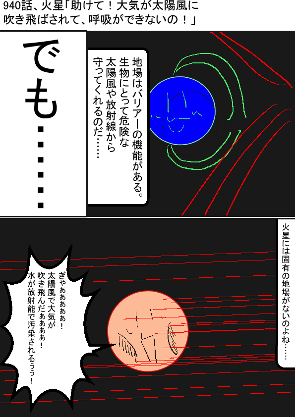 (´・ω・`)火星タンは、小柄すぎて中まで冷えて固まってしまい、惑星のお洋服たる磁場を無くしてすぽんぽんになってしまったじゃ 大気は、下着みたいものじゃから太陽風の圧倒的な風速の前にはなすすべなしなのじゃ 太陽氏は、えっちなやつなのじゃな