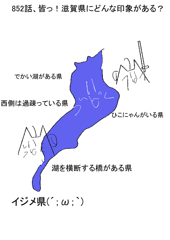 ★(ノ゜ω゜)(ノ゜ω゜)先生ぇー!滋賀県の印象を語るんだ!†(´・ω・`)琵琶湖 ★(ノ゜ω゜)(ノ゜ω゜)大きな湖ですね。他には?†(´・ω・`)鳥人間コンテスト県 ★(ノ゜ω゜)(ノ゜ω゜)アンタ!?毎年、墜落する鳥人間を見て和んでるだろ?!†(´・ω・`)ひこにゃん県 ★(ノ゜ω゜)(ノ゜ω゜)彦根市をこっそり宣伝しやがった!?†(´・ω・`)こしひかりが美味い件(県) ★(ノ゜ω゜)(ノ゜ω゜)まさかのダジャレ!?†(´・ω・`)ちなみに、お主らの滋賀県の印象は? ★(ノ゜ω゜)(ノ゜ω゜)イジメ県!†(´・ω・`)やめて!?そのイメージ!