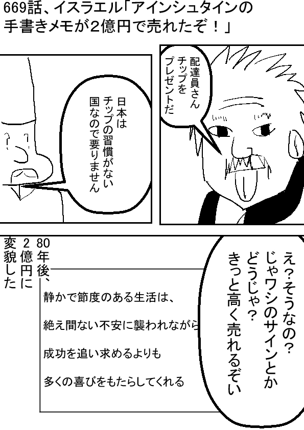 ★(ノ゜ω゜)(ノ゜ω゜)先生ぇー!?手書きメモが2億円ってどういう事だぁー!? ●(´・ω・`)ほら、アインシュタインはユダヤ人で、偉大な科学者じゃろ? ★(ノ゜ω゜)(ノ゜ω゜)それがどうかしたの? ●(´・ω・`)エルサレムはイスラエルじゃから……めっちゃ現地で人気がある人物なんじゃ。 つまり、需要が高いからこそ、2億円という値がついた訳じゃな? ★(ノ゜ω゜)(ノ゜ω゜)じゃ、先生も手書きの便箋を誰かに渡せば、80年後に……ゴミ置き場いき! ●(´・ω・`)ふぁっ!?価値がない!? ★(ノ゜ω゜)(ノ゜ω゜)2億円のチップって最高ですよね…… | ||||||